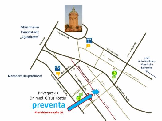 Anfahrtskizze (Plan als PDF laden) der Praxis in der Rheinhäuserstr. 50, 68165 Mannheim